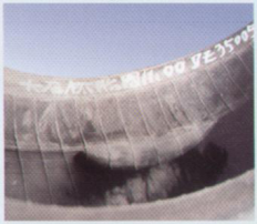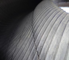 Symptoms:Inside the tyre( near the shoulder), the arrangement of the partial carcass cords can be seen clearly. The inner liner is broken along the leaking line, and the “U”explosion happens on the sidewall.